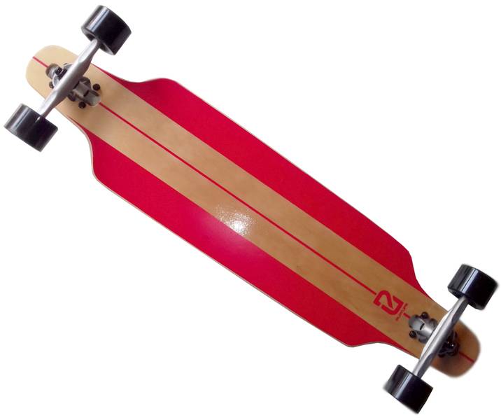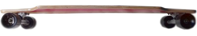 - Deck: Material: 7 Lagen chinesisches Ahornholz, Griptape: schwarz, Shape: concave, ohne kicktail, bend: flat,twinlike, Achsmontage: dropthrough mount, Abmessungen: 38 inch x 9.25 inch = 96,5 x 23,5 cm, Wheelbase 78 cm, Flex: hart
